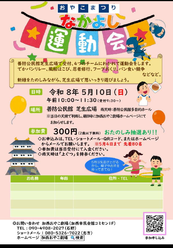 氏名、参加される方の学年、年齢、人数、連絡先(住所、電話番号)など